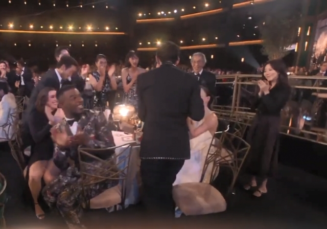 이정재는 임 부회장과 손을 맞잡고 기쁨을 나눈데 이어 옆 테이블에 있던 미국 배우 엘 패닝과 반갑게 양손을 잡은 뒤 무대로 향했다. 엘 패닝은 ‘오징어 게임’의 열렬한 팬으로 알려져 있다.