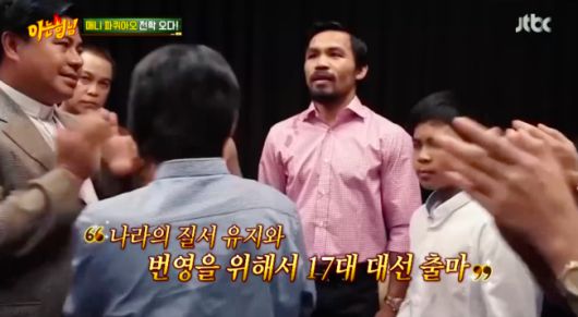 파퀴아오는 세계에서 첫 번째로 복싱 8체급 석권을 달성한 필리핀 복싱 영웅으로 2022년 필리핀 대통령 선거에 출마했다. 이에 형님들은 ‘어떻게 출마했냐’라는 물었다.