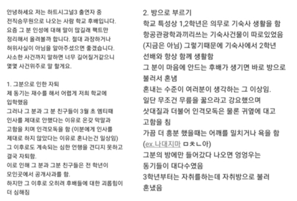 작성자에 따르면 '하트시그널 시즌3' 승무원 출연자는 대학 재학 당시 후배들에게 막말과 고함을 치며 인격 모독을 일삼았고, 이로 인해 글쓴이의 동기 중 한 명이 자퇴하기도 했다.