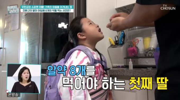 평소 집안일과 육아를 적극적으로 한다는 전환규는 아내가 쌍둥이를 챙기는 사이 등교하는 딸의 약을 챙겼다. 초등학교 1학년인 딸은 등교 전 무려 알약 8개를 먹어야했다.