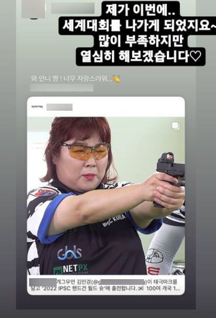 개그우먼 김민경이 태극마크를 달고 국제실용사격연맹 사격대회에 출전하게 되어 관심이 높아지고 있다.