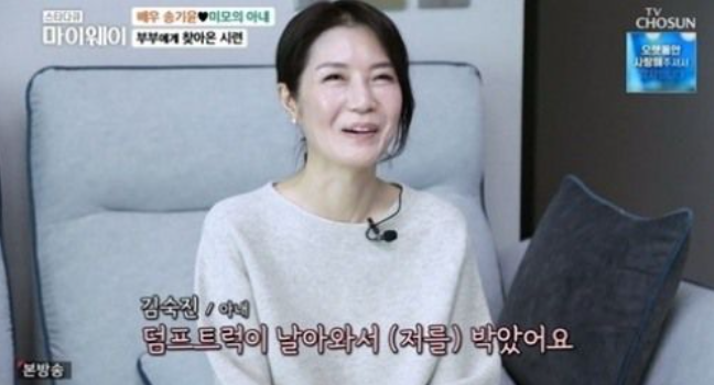 부부는 당시 차가 폐차 상태로 형태가 어그러질 정도로 심각한 사고였다고 전했다. 아내는 “머리부터 발끝까지 안 아픈 곳이 없었다. 휴우증이 정말 심했다"라면서 옆에서 도와준 남편 송기윤 덕분에 회복할 수 있었다며 고마운 마음을 전했다.