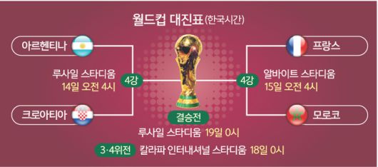 모로코가 포르투갈을 꺾으며 아프리카 국가 최초로 월드컵 4강 진출의 쾌거를 이루면서 이번 대회에는 유럽 2개국, 남미 1개국, 아프리카 1개국이 우승컵을 놓고 자웅을 겨루게 됐다.