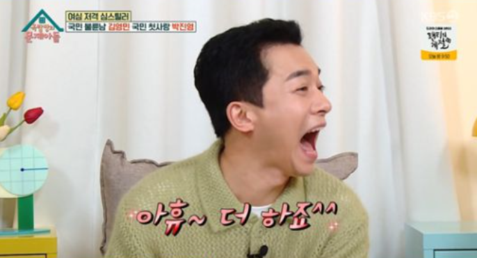정형돈은 "아내분이 '난 왜 쟤처럼 안 해줘?' 이런 말은 안 하시냐"라고 하자, 김영민은 "더 하죠"라며 너스레를 떨어 눈길을 끌었다.
