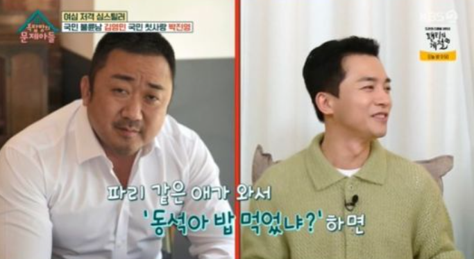 이어 김영민은 "마동석 씨와 친구라고 하면 주변에서 다들 놀란다. (마동석은) 팔이 어깨에 안 닿아서 파리도 잘 못 잡는 스타일인데 파리 같은 애가 옆에 가서 '동석아 밥 먹었냐?'라고 하면 후배들이 다 놀란다"고 말했다.