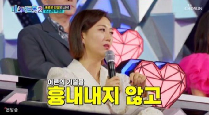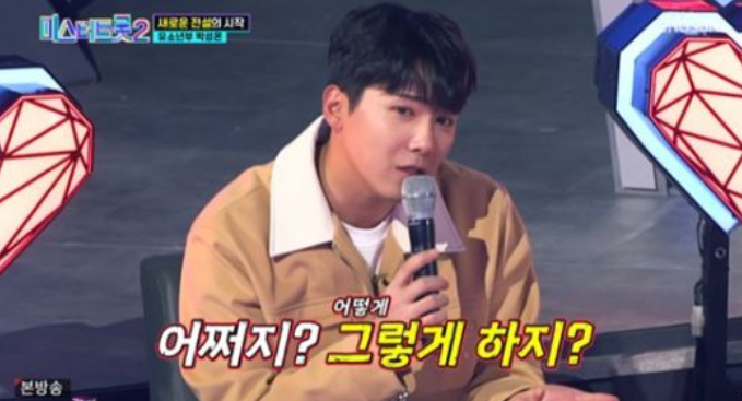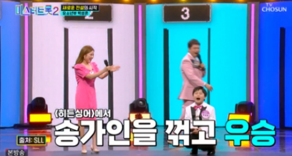 “‘송가인을 이기고 온’이 무슨 뜻이냐”라고 묻자, 박성온은 “송가인 누나와는 일로 만난 사이인데, 다른 프로(히든싱어)에서 송가인 누나를 이기고 우승까지 한 적이 있다”라고 설명했다.