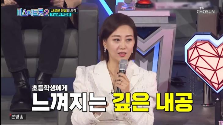 이어 장윤정은 "박성온은 본인 톤에 맞게, 어른의 기술 이상을 한다, 어른 흉내를 자칫 잘못하면 징그러울 수 있는데 유소년부에 그런 친구가 없다, 대단하다"라고 말하며 놀라워했다.