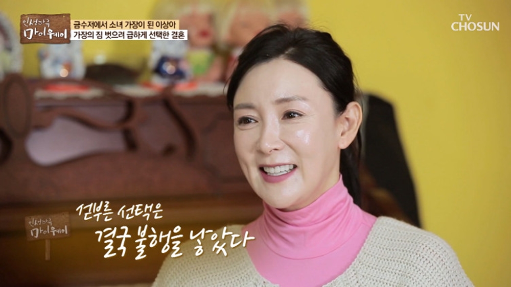 이상아는 ”결혼은 곧 가족이라는 그림을 갖고 있었다. 딸이 어릴 때 새 아빠를 만들어주고 싶었다. 그때 당시에 힘들었는데 저를 도와준 남자가 있었다. 이런 남자는 의지하면서 살 수 있겠다 싶었다“고 말했다.