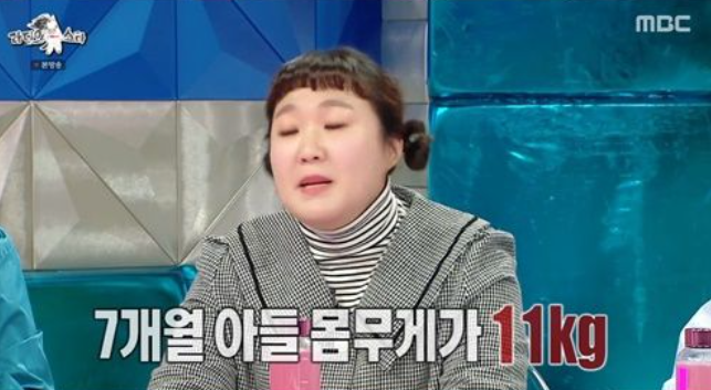 이수지는 "이제 7개월쯤 됐는데 체중은 11kg쯤 된다"라고 말해 MC들을 깜짝 놀라게 만들었다.